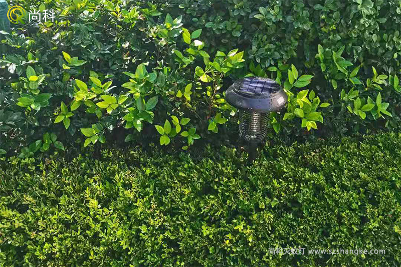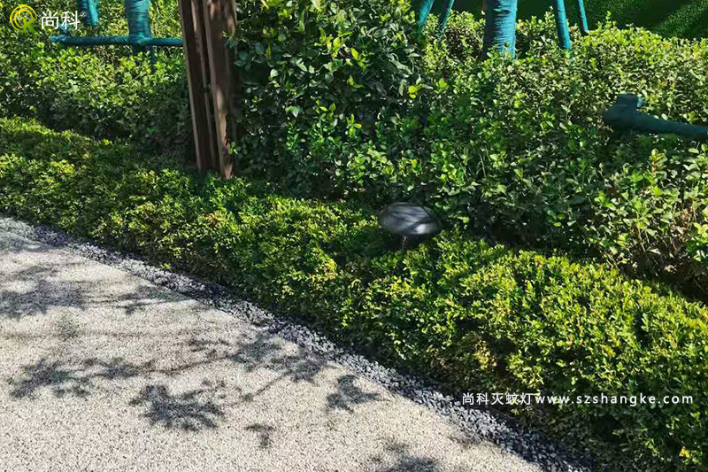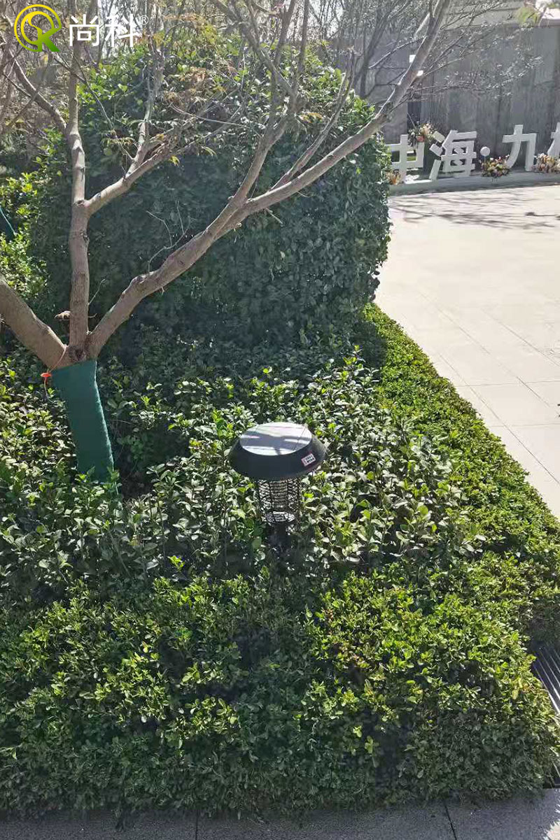 尚科太陽能滅蚊燈安裝在綠化帶沒問題,不過這里有樹木遮擋了頂部太陽能板,會影響滅蚊燈充電。